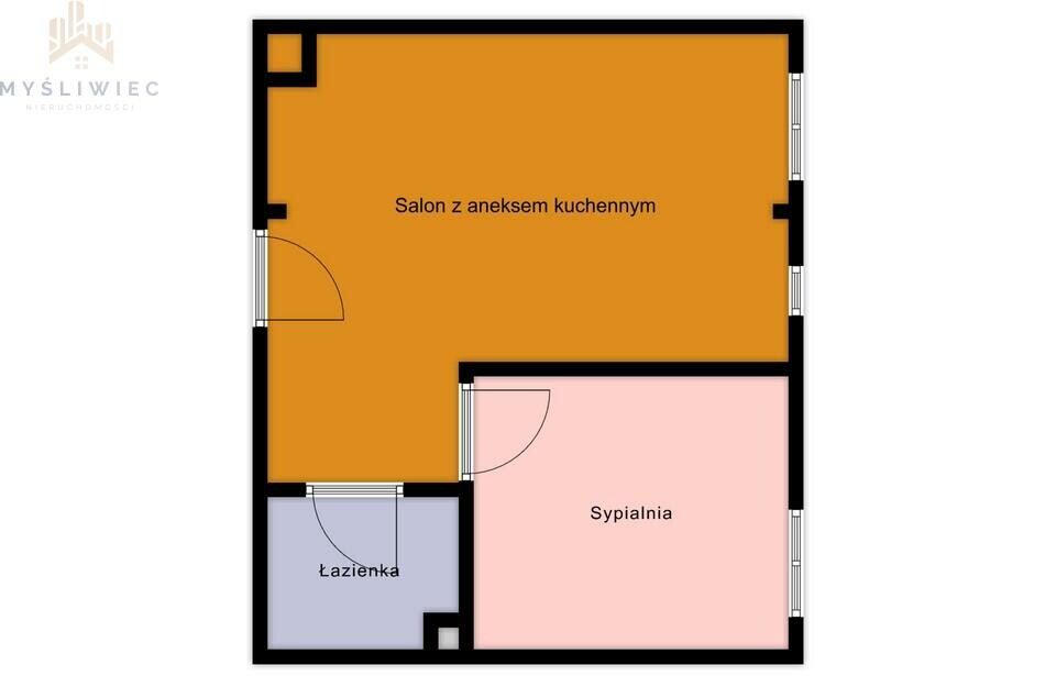 - duży pokój dzienny z dwoma oknami, aneksem kuchennym i wyjściem na balkon