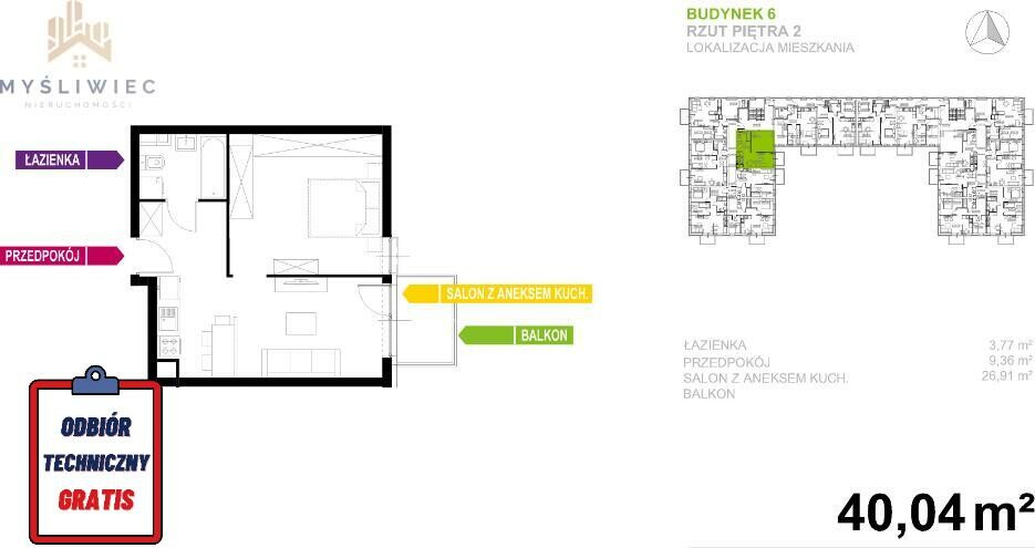 Mieszkanie o powierzchni 40,04 m2 jest zlokalizowane na 2 piętrze budynku czteropiętrowego z windą. Mieszkanie posiada balkon.