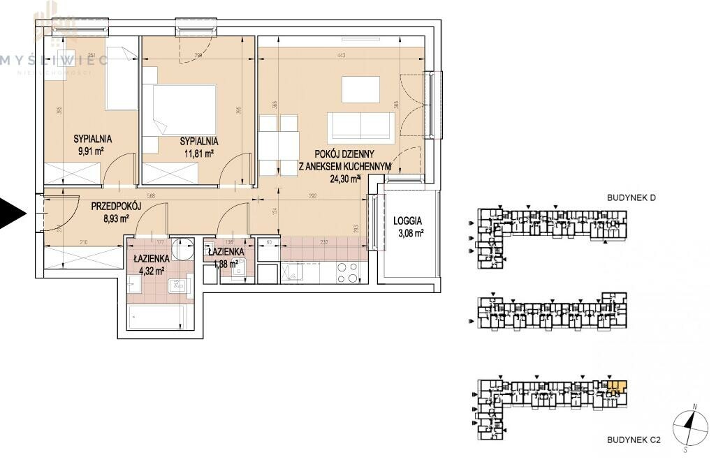 Mieszkanie o powierzchni 60,65 m2 jest zlokalizowane na 1 piętrze. Mieszkanie jest trzypokojowe, narożne, z osobnym wc i loggią.