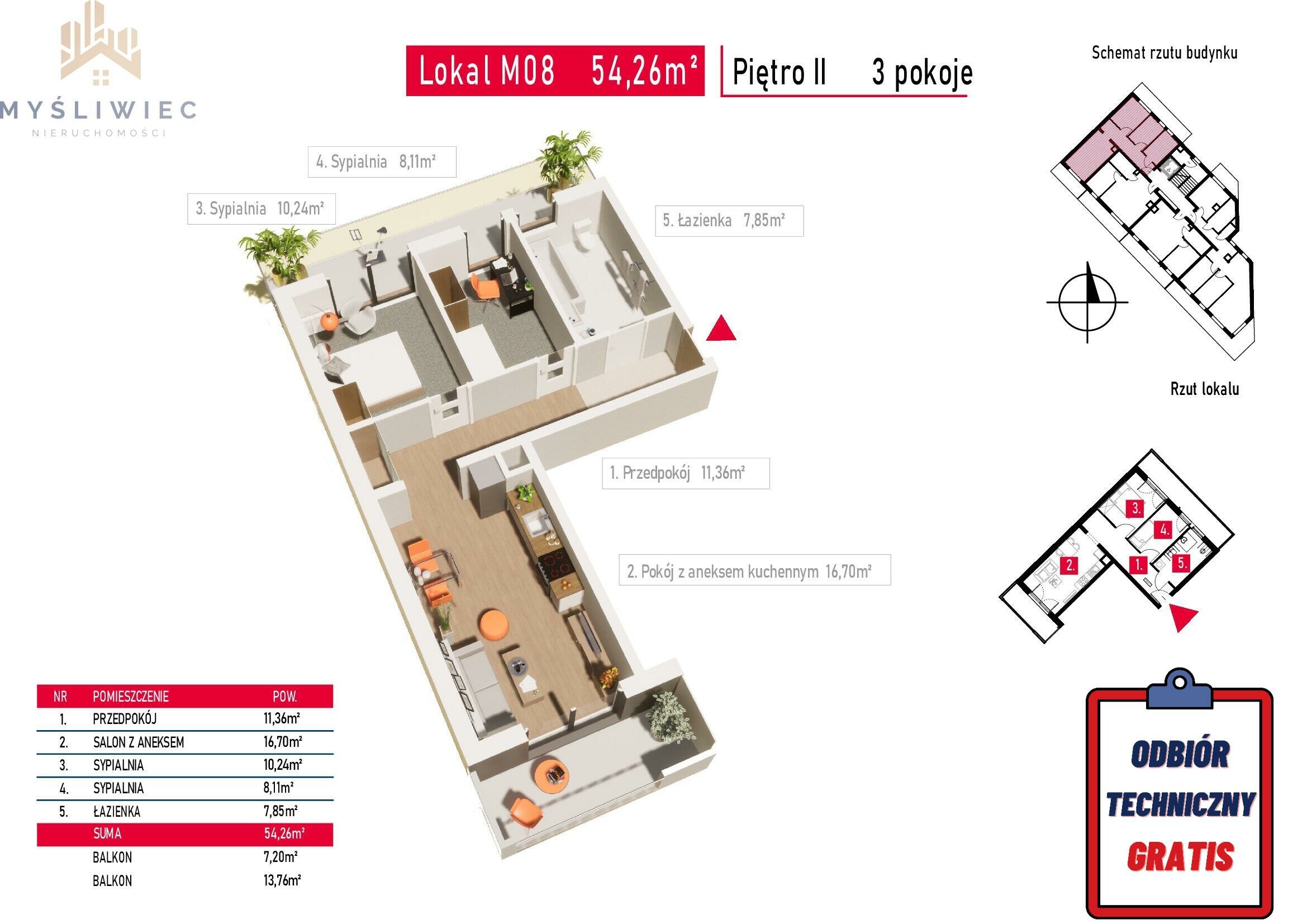 Mieszkanie o powierzchni 54,26 m2 jest zlokalizowane na 2 piętrze. Mieszkanie posiada loggię.