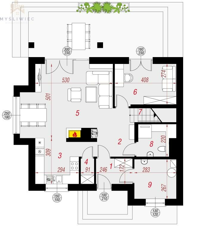 - salon z kominkiem i wyjściem na taras,